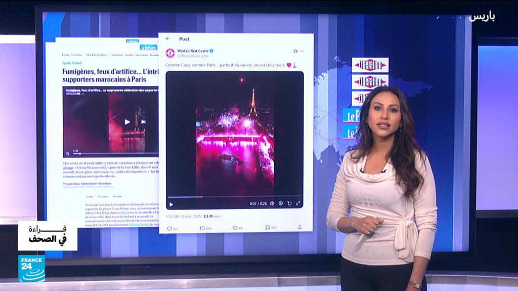 في عناوين الصحف اليوم: زيارة “تاريخية” للرئيس السوري الانتقالي أحمد الشرع إلى البيت الأبيض واتفاق أمني محتمل لمكافحة تنظيم الدولة الإسلامية وتقارب في العلاقات بين سوريا وإسرائيل – جدل حول قانونية بقاء الرئيس الفرنسي الأسبق “نيكولا ساركوزي” في السجن رغم طعنه في الحكم – ذكرى مرور عشر سنوات على هجمات ال13 من نوفمبر في باريس – جدل في فرنسا بسبب احتفال رابطة مشجعي نادي الوداد المغربي بالشماريخ والألعاب النارية في قلب باريس من دون علم الشرطة.
